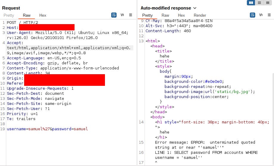 Rất nhanh mình đã phát hiện ra vị trí tồn tại lỗ hổng SQL Injection nằm tại tham số username