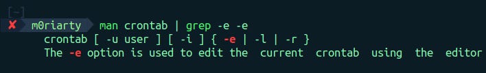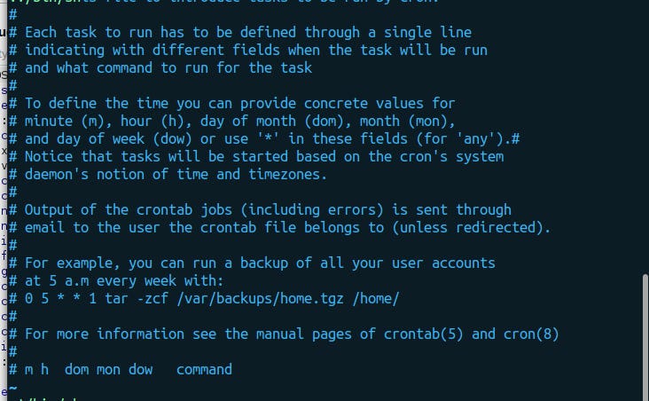 Mặc định, crontab sẽ sử dụng VIM làm trình chỉnh sửa chính. Mình có thể sử dụng chế độ COMMAND mode của VIM để tạo một shell mới bằng cú pháp: