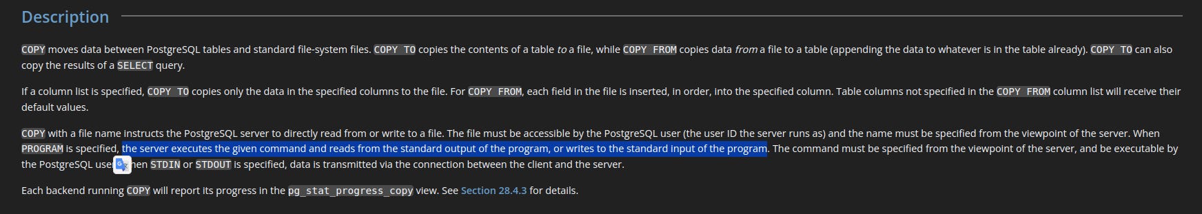 Qua một vài phút tìm kiếm trên Google, thêm được thông tin rằng PostgreSQL có thể thực hiện thực thi lệnh hệ thống và ghi kết quả vào trong cơ sở dữ liệu sử dụng lệnh COPY với thiết lập PROGRAM được chỉ định.