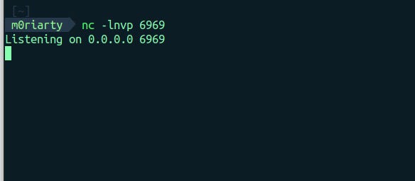Trên máy tính cá nhân, mở terminal và gõ lệnh nc -lnvp 6969 để mở cổng 6969 ở trạng thái LISTEN