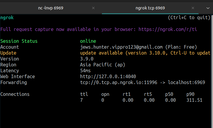 Sử dụng ngrok để tạo một forward ip, sử dụng giao thức TCP dẫn tới cổng 6969 ở localhost bằng lệnh ngrok tcp 6969