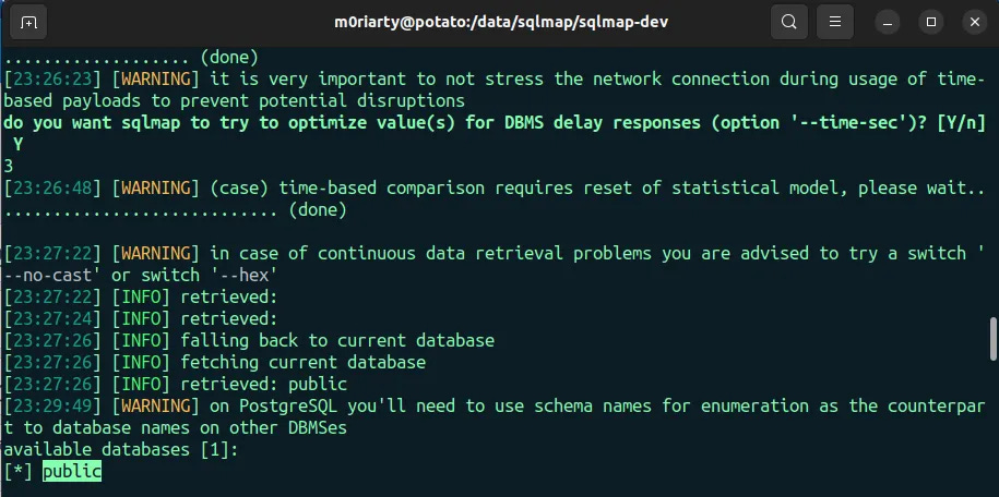 Lỗ hổng SQL Injection này được xếp vào dạng Blind SQL Injection (vì không trả về kết quả của câu truy vấn). Sử dụng cách khai thác Time-based (hoặc dùng SQLMap nếu bạn lười), xác định được hệ quản trị cơ sở dữ liệu hệ thống đang sử dụng là PostgreSQL.