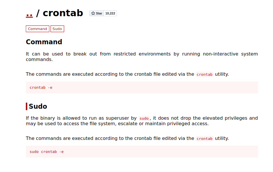 Mình thấy người dùng hiện tại cũng được set SUID cho lệnh crontab. Sau khi tham khảo https://gtfobins.github.io/, mình đã thấy được cách để leo lên root từ lệnh crontab