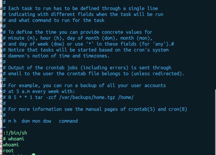 crontab -ebằng quyền root, tiến trình VIM editor dùng để sửa các tiến trình crontab cũng sẽ được chạy dưới quyền root. Và từ đó, khi sử dụng COMMAND mode của VIM editor để tạo ra một shell mới, chúng ta sẽ tương tác với shell đó dưới quyền root.