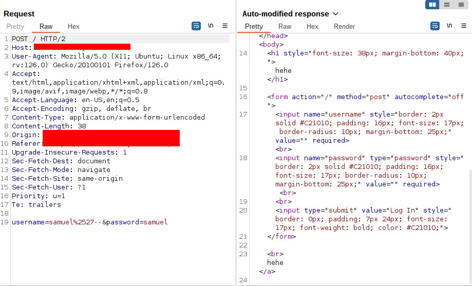 Vì một vài lí do bảo mật, mình sẽ che URL của trang web và sửa một vài thông tin ở HTTP Response để tránh lộ lọt thông tin nhạy cảm